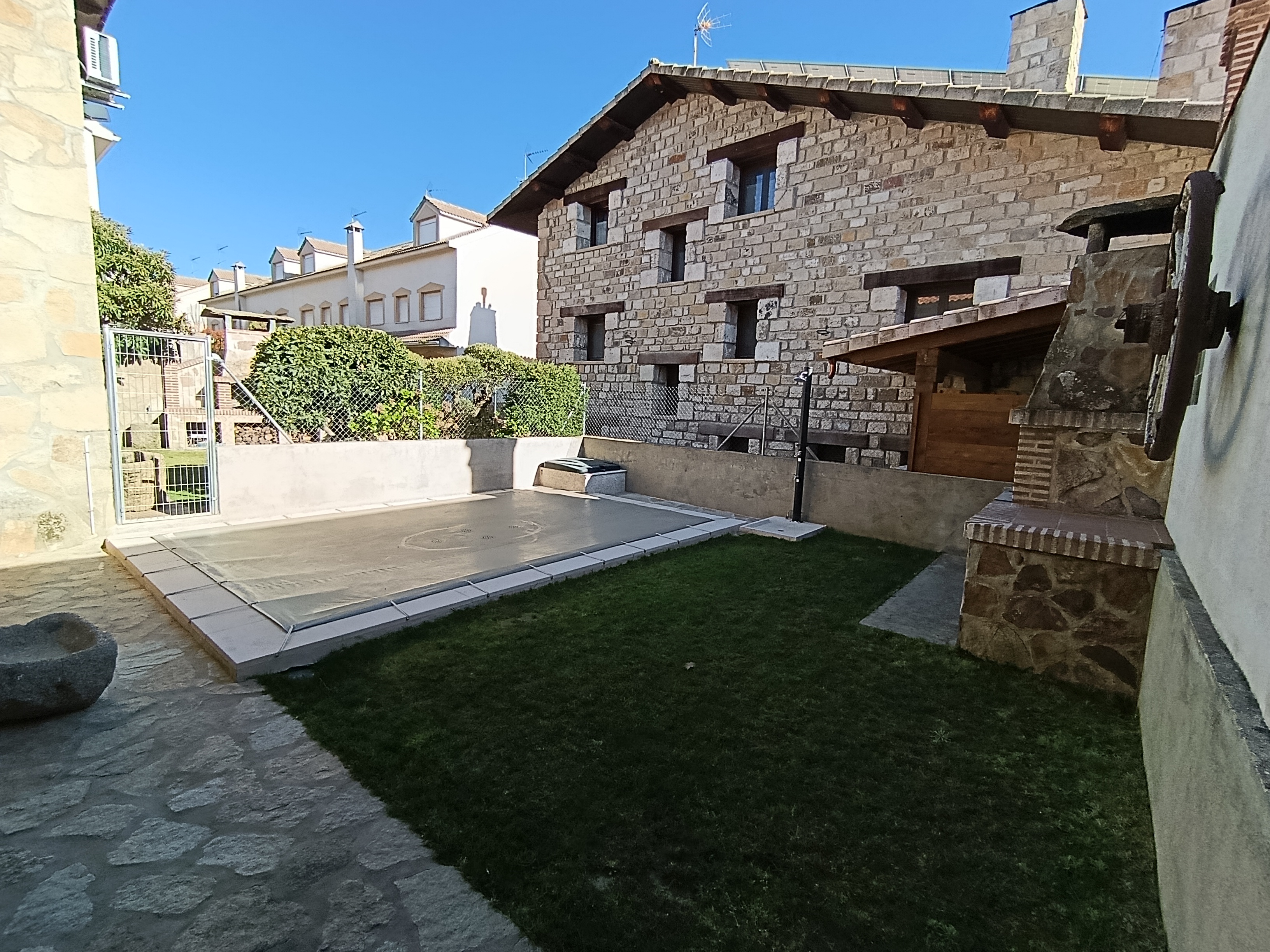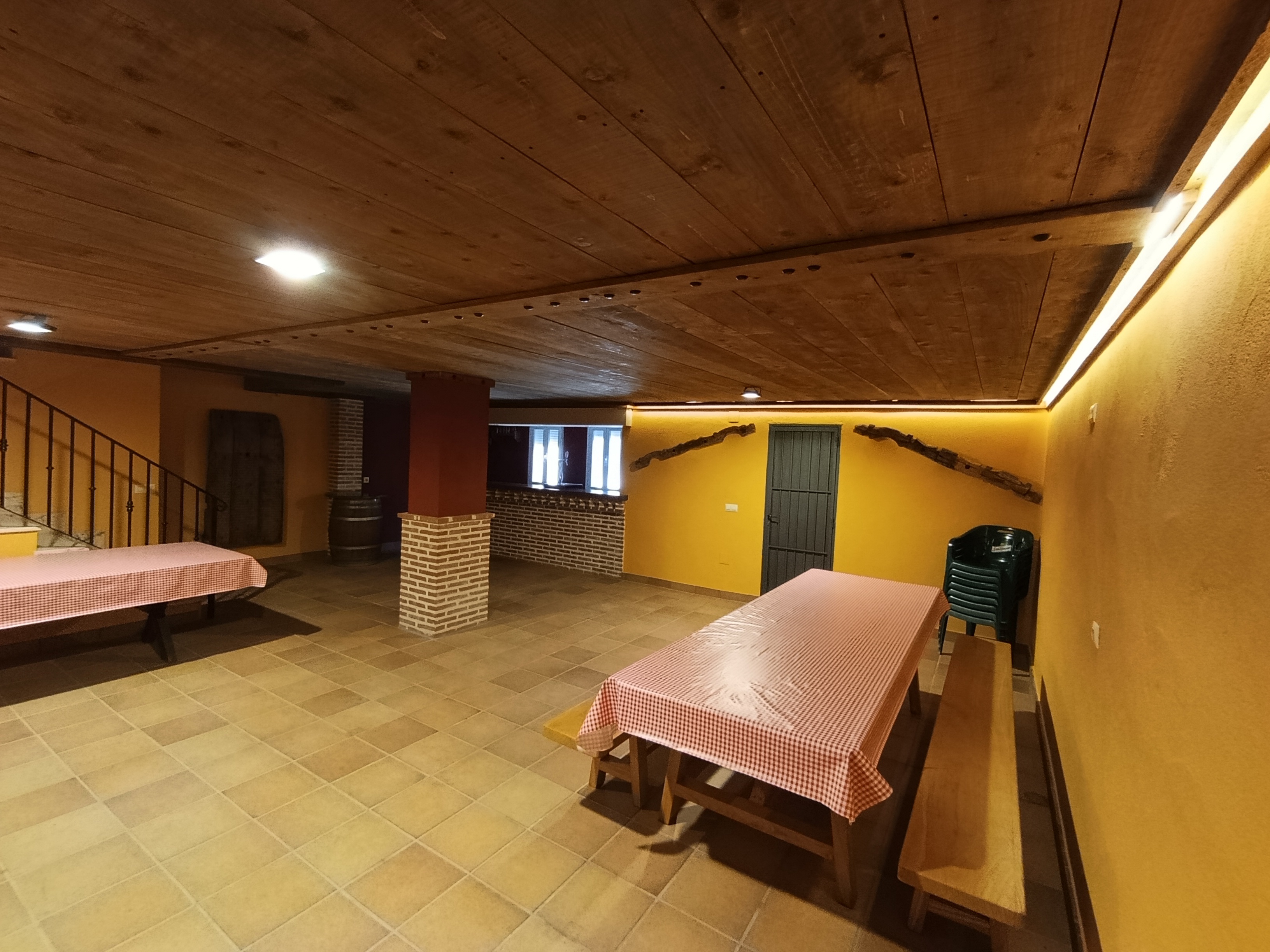 El sótano está pensado como zona social para reuniones y celebraciones: espacio tipo bar con zona de convivencia y mesa para comidas en grupo. En el exterior, porche y jardín con barbacoa de obra y leña, ideal para veladas al aire libre.